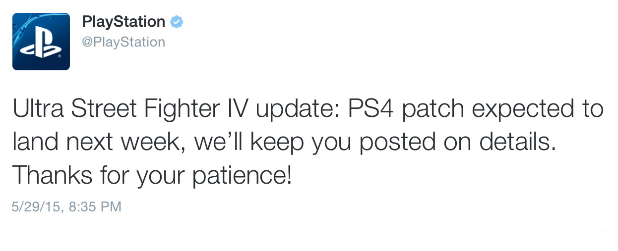 Ultra Street Fighter IV PS4 Patch Coming Next Week May 30, 2015 / Jeff Jones Sony and Capcom said they would handle this pretty quickly and it looks to be true. Share this: Click to share on X (Opens in new window) X Click to share on Facebook (Opens in new window) Facebook Like Loading...