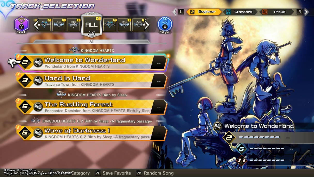 The demo itself gives you a good representation of what to expect, difficulty wise. The songs featured have a good range of difficulty from easy songs, like Welcome to Wonderland, to hard songs, like Wave of Darkness I. In addition to that, there are three difficulty modes and three different play styles to choose from. The difficulty modes are beginner, standard, and proud mode; similar to every other Kingdom Hearts game. As for the different styles, you have basic, one button, and performer.